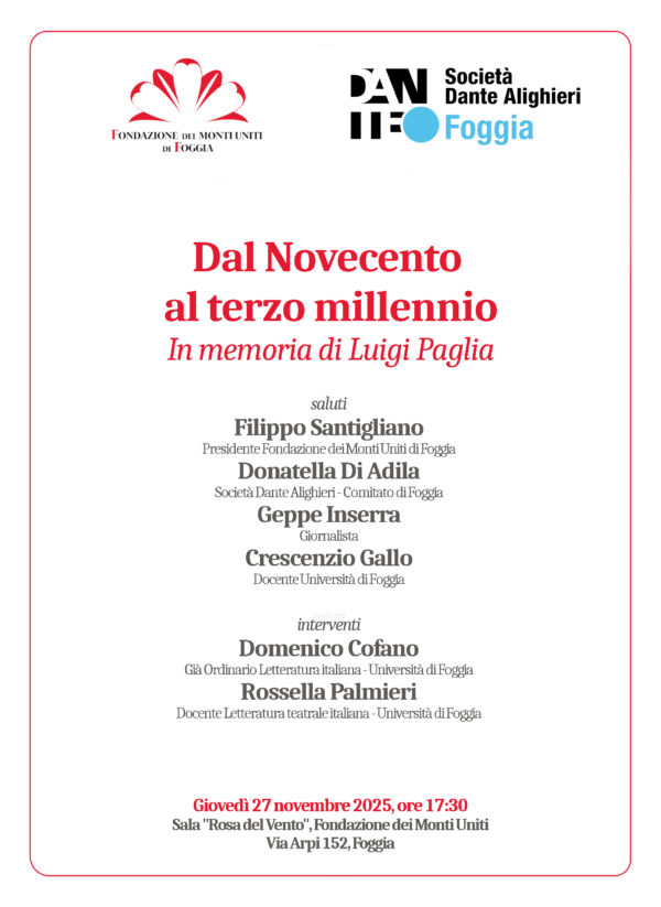L’iniziativa, promossa dalla Fondazione dei Monti Uniti di Foggia e dal comitato di Foggia della Società Dante Alighieri, vuole essere non solo un momento di ricordo, ma anche un’occasione per attraversare alcune delle voci più significative della poesia e della prosa novecentesca, a partire dall’eredità critica e civile di Paglia.