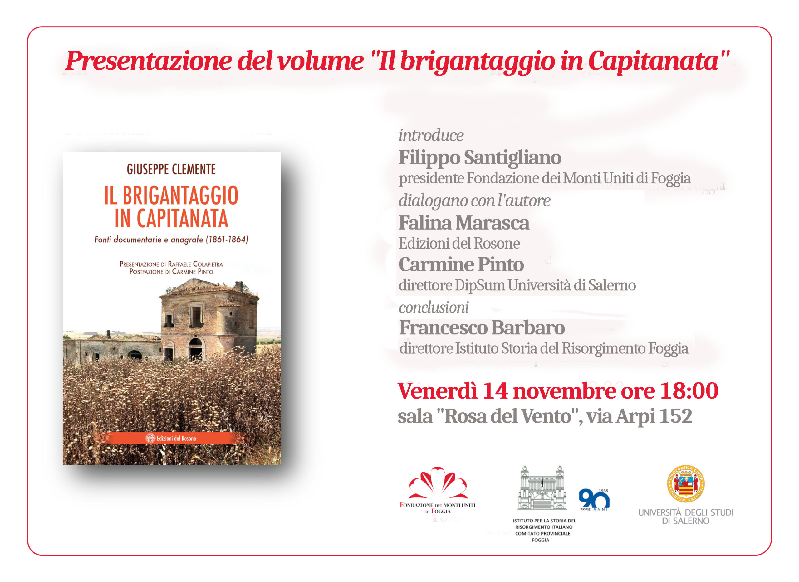Venerdì 14 novembre 2025, alle ore 18:00, la sala “Rosa del Vento” della Fondazione dei Monti Uniti di Foggia (via Arpi 152) ospiterà la presentazione del volume di Giuseppe Clemente, “Il brigantaggio in Capitanata. Fonti documentarie e anagrafiche (1861-1864)”, recentemente ristampato da Edizioni del Rosone a seguito del grande interesse suscitato tra studiosi e appassionati.