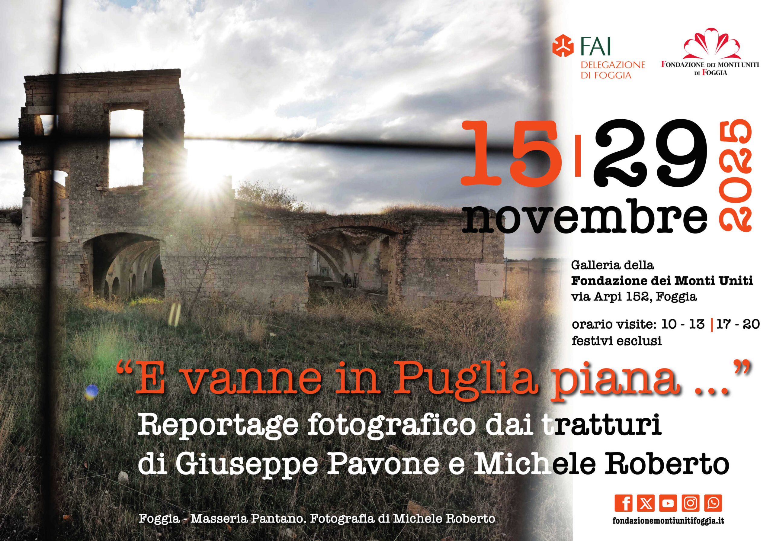 È stata inaugurata sabato 15 novembre, nella sala “Rosa del Vento” della Fondazione dei Monti Uniti di Foggia, la mostra fotografica “E vanne in Puglia piana…”, firmata dai fotografi Giuseppe Pavone e Michele Roberto, realizzata dalla Fondazione in collaborazione con il FAI – Fondo per l’Ambiente Italiano, delegazione di Foggia.