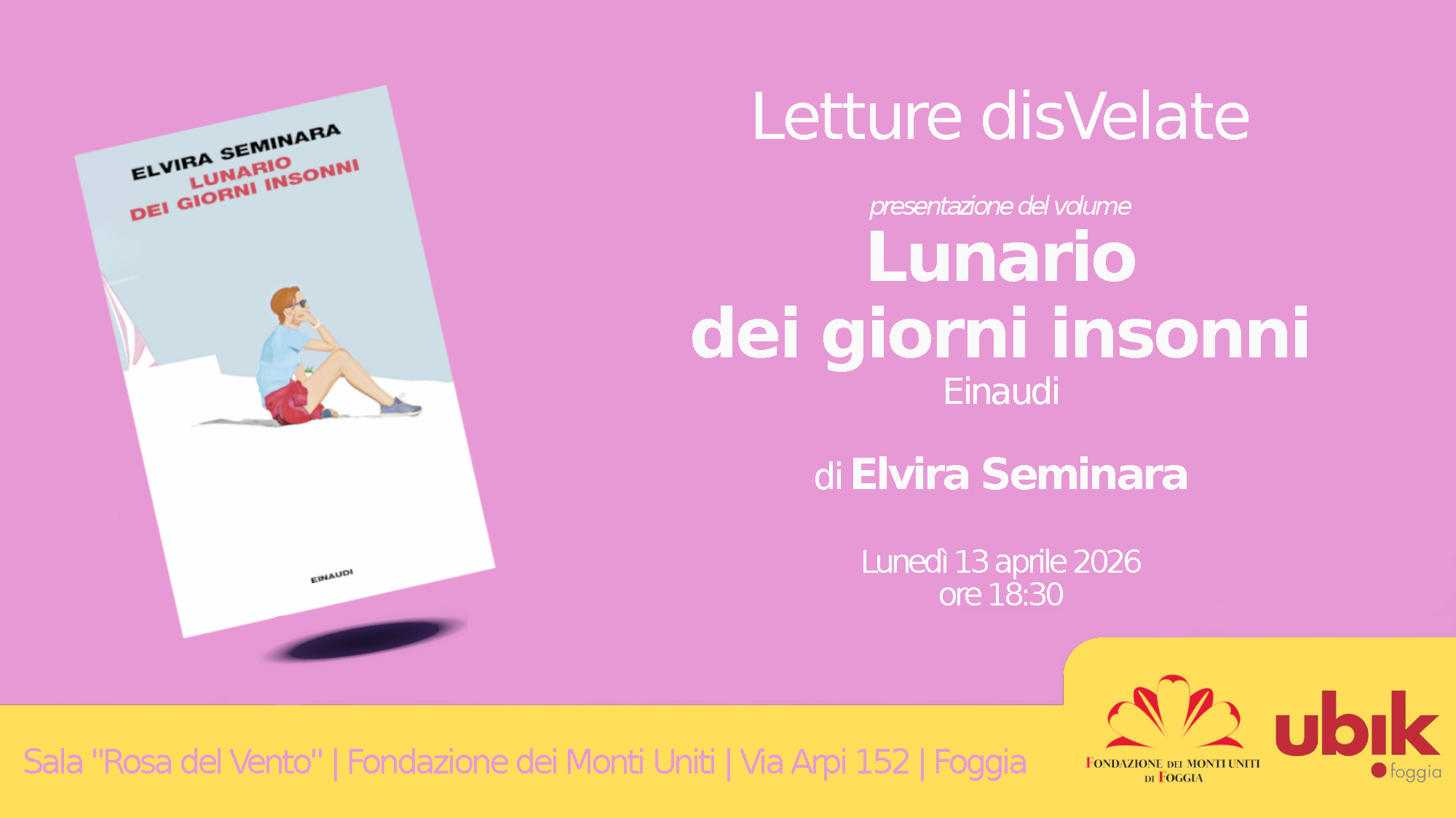 Il prossimo appuntamento è in programma lunedì 13 aprile alle ore 18:30, presso la sala “Rosa del Vento” della Fondazione, in via Arpi 152. Ospite dell’incontro sarà la scrittrice Elvira Seminara, che presenterà il suo nuovo romanzo Lunario dei giorni insonni pubblicato da Einaudi nel 2026.